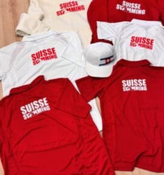 Suisse Swimming Kollektion: T-Shirts und Hoodies in Rot und Weiß auf Holzboden, perfekt für sportliche Aktivitäten oder entspannte Tage.