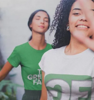 Graue und schwarze T-Shirts mit „GREENFAB“ Schriftzug liegen auf hellem Holzboden. Perfekt für umweltbewusste Modefans!